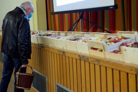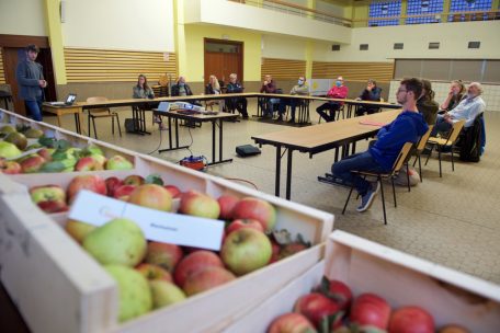 Nach der Untersuchung des Fruchtfleischs führt ein weiterer Bestimmungsschritt in das Kerngehäuse des Apfels. Auch hier gibt es wiederum wesentliche Unterscheidungsmerkmale, so Marc Thiel. Beispielsweise die Form, Struktur und Größe. Der Kern kann rundlich oder oval, klein oder groß sein. Die Fasern des Kerns variieren von fest bis grob und können je nach Sorte anders gestreift sein. Nach einer gut gefüllten Portion Theorie führte Marc Thiel die Anwesenden anhand unterschiedlicher Äpfel in die praktische Sortenbestimmung ein.