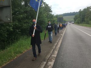 Mit einer ebenso symbolischen wie spontanen und friedlichen Aktion setzten sich am Ende der offiziellen Zeremonie etwa 100 Menschen in Bewegung und trugen die Europaflagge unter Aufsicht einer sehr entgegenkommenden Polizei über die Grenzbrücke bis zum Kreisverkehr zwischen Perl und Apach und wieder zurück. Es hätte auch die große „Schengen is alive“-Fahne sein können. Die war bestellt, konnte aber nicht bis zum Samstag geliefert werden.