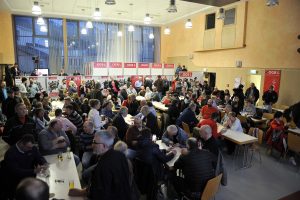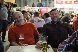 Menschen drücken sich aneinander. Manche versuchen ein Brötchen zu ergattern, andere halten ein Bier in der Hand, dazwischen gehen die Blicke in der „Maison du peuple“ hoch zur Leinwand mit den neuesten Ergebnissen. Im Hintergrund ertönt die Musik einer Bluesband. Und mittendrin: André Roeltgen. Der Präsident des OGBL lächelt, schüttelt Hände, spricht mit den Gewerkschaftsmitgliedern und Politikern und stellt sich den Fragen der Presse. Doch kurz vor 22 Uhr kann auch er sich noch nicht definitiv äußern. Sein Blick wandert auf einen Satz DIN-A4-Seiten mit den neuesten Zahlen der Wahl. „Viele Ergebnisse fehlen noch, insbesondere die Auszählungen in den großen Unternehmen“, sagt Roeltgen. Aber: „Nach allem, was wir jetzt von Ergebnissen haben, sieht es positiv aus. Das ist für mich die allgemeine Tendenz“, meint der OGBL-Präsident und schiebt noch ein „im Moment“ hinterher.