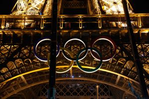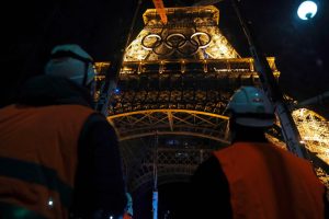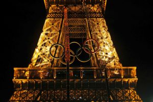 Die Ringe waren von ArcelorMittal für die Spiele in mehreren französischen Produktionsstätten gefertigt worden und im Juni zwischen der ersten und der zweiten Etage des Eiffelturms in Paris aufgehängt worden. Die Ringe waren in den olympischen Farben bemalt und nachts weiß beleuchtet.