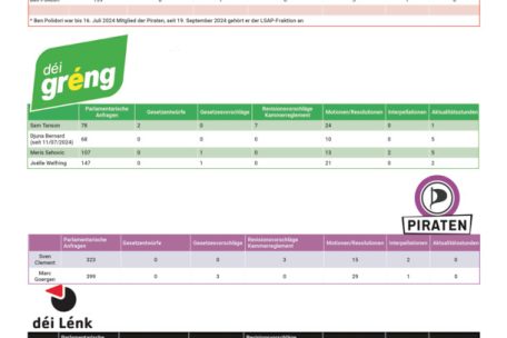 Die Oppositionsparteien nutzen die Instrumente zur Regierungskontrolle, die das Kammerreglement bietet, extensiver als die Mehrheit. Die Rangliste der meisten parlamentarischen Anfragen führen die beiden zerstrittenen Abgeordneten der Piraten an. Marc Goergen alleine stellte seit Oktober 2023 so viele Anfragen wie die vier Grünen-Abgeordneten zusammen, Sven Clement so viele wie die gesamte ADR-Fraktion. Das liegt auch daran, dass die Piraten eine Webseite eingerichtet haben, auf der Bürger eine Anfrage vorschlagen können, was den beiden Abgeordneten vielleicht die Arbeit erleichtert. Auch wenn die Relevanz der Themen und die Qualität der gestellten Fragen manchmal darunter leiden.