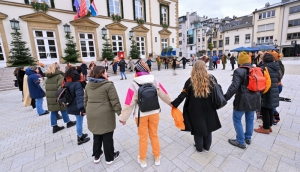 Ein Zeichen gegen Gewalt an Mädchen und Frauen setzen – das war das Ziel einer Aktion am Freitag vor dem Rathaus in Luxemburg-Stadt. Rund 50 Menschen, darunter auch einige Mitglieder des hauptstädtischen Gemeinderats, kamen zur Mittagszeit auf dem „Knuedler“ zusammen, um sich dort die Hände zu reichen und gemeinsam einen großen Kreis zu bilden. Viele von ihnen trugen orangefarbene Kleidung, Mützen oder Schals. Die Signalfarbe wird weltweit bei der sogenannten „Orange Week“ verwendet, um sich gegen alle Formen von Gewalt starkzumachen: gegen häusliche, psychische oder auch sexualisierte.