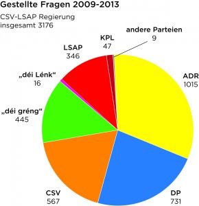 Nach der CSV folgen die DP mit 727, die ADR (die unter der vorigen Regierung die meisten Fragen, insgesamt 1.015, stellte) mit 514, die LSAP mit 482 und die Grünen mit 247 Fragen. Die „déi Lénk“-Abgeordneten brachten es auf 196 Fragen – gegenüber 16 in der vorherigen Legislaturperiode.