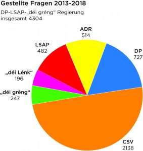 Waren dies während der vorherigen Legislaturperiode unter der CSV-LSAP-Regierung insgesamt 3.176, so nahm die Neugierde unter der aktuellen DP-LSAP-Grüne-Regierung um ein Viertel zu. 4.303 parlamentarische Anfragen wurden zwischen 2013 und 2018 gestellt.
