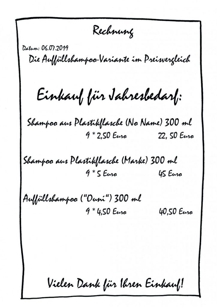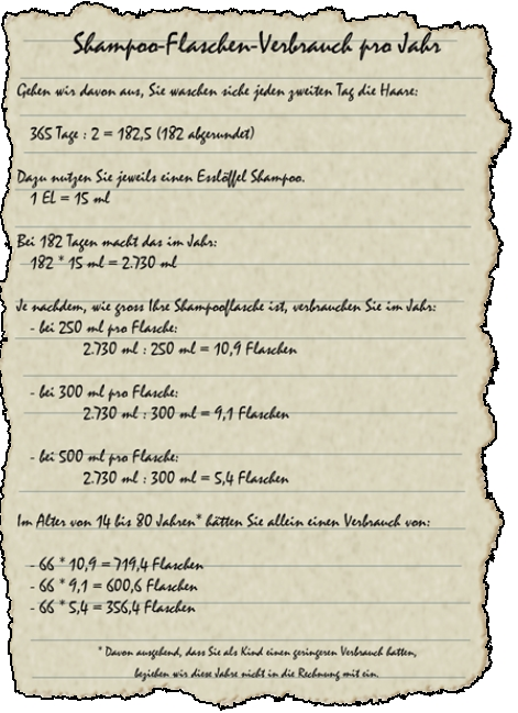 Nehmen wir Shampoo als konkretes Beispiel. Die große Mehrheit der Menschen greift auf handelsübliche Produkte aus dem Supermarkt zurück. Diese werden in der Regel in Plastikflaschen verkauft. Je nach Fassungsvermögen und Shampoo-Verbrauch wandern so zwischen 5 und 11 Flaschen pro Jahr in den Plastikmüll.