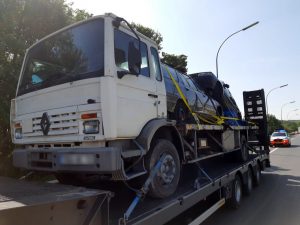 daat as éen "déjà vu"! Mir hun nogekuckt , wéi eng Camionette emfonktionéiert als Camion, deen och 2 Autoen gelueden haat: Un der Camionette wor en Unhänger ugeschloss mat och 2 Autoen drop an de Chauffer wor am gangen Sprit an Containeren ze tanken, déi hien an déi 4 Autoen vollgestoppt huet. D'Camionette wor a Polen iimmatrikuléiert