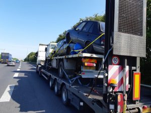 Polizei stoppt Lkw, der Lkw transportiert, der Autos transportiert