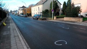 In der rue d’Athus finden sich am Dienstagmittag (29.11.) Blutspuren auf dem Asphalt der Straße, in Höhe der 30er-Hausnummern. Die Spurensicherung der Polizei hat diese offenkundigen Folgen einer Gewalttat mit Kreide umsprüht, auch auf dem Gehsteig finden sich einige derartige Markierungen. Der Polizei zufolge ist ihr am frühen Morgen gegen 5.35 Uhr gemeldet worden, dass „eine Person in der rue d’Athus in Petingen Opfer eines Messerangriffs“ geworden sei. Tatsächlich sei eine Person aufgefunden und schwer verletzt ins Krankenhaus gebracht worden. Die Straße wurde für die Ermittlungen zeitweilig gesperrt.