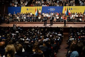 Dabei beeindruckte Macron durchaus mit seinen rhetorischen Fähigkeiten. Als eine Schülerin seinen Rat für die junge Generation wissen wollte, begann er äußerst leise, sodass die Philharmonie-typischen Huster hörbar wurden. Doch es folgte ein Crescendo – Macron steigerte die Lautstärke, bis er schließlich zu seiner Pointe kam: „Vergesst nichts. Und traut euch!“ Jubel. Standing Ovations. Insofern war die Philharmonie durchaus der geeignete Ort für sein Auftritt.