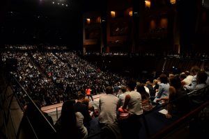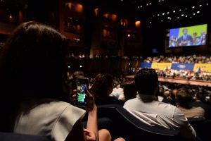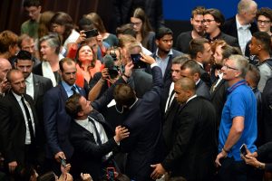 Doch der eigentliche Star, den Bettel kurz vor den Nationalwahlen nach Luxemburg lud, war Emmanuel Macron. Mit knapp einstündiger Verspätung waren beide Politiker in der Philharmonie angekommen, die restlos bis auf den letzten Platz besetzt war. Und sie erhielten prompt Standing Ovations. Wie Popstars. Als Emmanuel Macron sein Publikum mit einem kräftigen „Moien“ begrüßte, war klar, dass er an diesem Abend leichtes Spiel haben würde. Das Publikum klatsche und lachte – und war sichtlich begeistert, im gleichen Raum mit dem französischen Präsidenten sein zu dürfen.