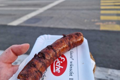 Gleich gegenüber der St.-Jakobshalle gibt es an einem Würstchenstand eine Basler Spezialität. Die „Basler Wurst“ ist mit Läckerli gewürzt, einem lebkuchenartigen Gebäck, für das Basel bekannt ist, informiert die Wurstverkäuferin. Nach der Geschmacksprobe ist die Grillwurst absolut zu empfehlen!