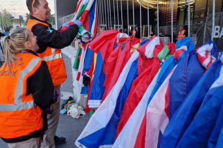 Zwar sind für die Fans viele Flaggen erlaubt – aber nicht in jeder Größe. Wer überdimensionierte Flaggen mitbringt, muss sie am Eingang abgeben. Die Security benutzt diese Flaggen als Dekoration an den Gittern beim Eingang. Auch ansonsten wird ganz genau kontrolliert, erzählen uns Gäste des ersten Halbfinals. Wer z.B. zu große Taschen dabei hat, wird am Eingang abgewiesen.