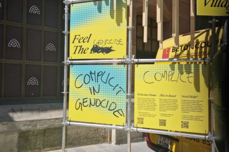 Gegen Israels Teilnahme wird auch in Basel protestiert. In der Nacht wurden einige Schilder im Zentrum auf dem Weg zum Eurovision Square beschmiert. Doch gleich am Morgen ist ein Eurovision-Team vor Ort, um neue Schilder aufzuhängen. Uns ist noch ein Foto vor der Austauschaktion gelungen.