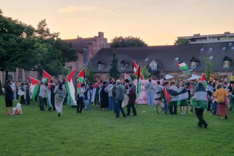 Auf dem Weg zum EuroVillage gibt es plötzlich eine Ankündigung in der Tram. Man werde eine Umleitung fahren. Wegen eines Protestzugs seien einige Straßen im Zentrum gesperrt. Eine kurze Recherche zeigt: Bewilligt war an diesem Abend keine Demo. Ich springe also aus der Bahn und mache mich auf die Suche. Wenige Straßen weiter erspähe ich palästinensische Flaggen. Eine kleine Gruppe bewegt sich durch die Basler Innenstadt, lose begleitet von ein paar Polizisten in gelben Warnwesten. Manche der Einsatzkräfte haben „Dialogteam“ auf dem Rücken stehen. Man wirkt aufmerksam, aber nicht angespannt. Ein Polizeisprecher vor Ort informiert: Es sind nur etwa 100-120 Personen, die am Zug teilnehmen. Der Protest sei zwar nicht bewilligt, aber bisher sei alles friedlich verlaufen. Wenige Minuten später bewegt sich der Zug von der Straße, weg von den Tramschienen und auf eine freie Grasfläche. Fahnen werden geschwenkt und ein paar Parolen ertönen, die aber vier, fünf Meter von der Gruppe entfernt schon nicht mehr zu verstehen sind. Von den langen, lautstarken Demozügen von Malmö ist man hier in Basel weit weg.