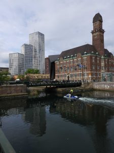 Die Polizei ist in Malmö deutlich präsent. Doch nicht nur Fuß- und Autopatrouillen sind gut sichtbar unterwegs. Auch Fahrrad- und Motorradstreifen sind kein ungewöhnliches Bild. Zweimal gucken musste unsere Journalistin allerdings, als die erste Jetski-Streife am Kanal vorm Hotel vorbeifuhr. Selbst von ganz oben wird Wache geschoben: Auf einem der Dächer des Clarion Hotels wurde eine Polizeidrohne erspäht.