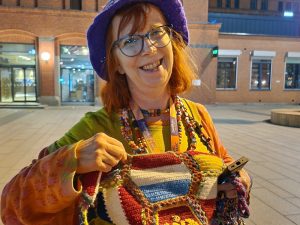 Mit so viel Farbe hat man am späten Abend nicht mehr gerechnet: ESC-Fan Leslie ist ein wandelnder Paradiesvogel. Ein Spitzname, den sie mit sehr viel Stolz trägt. Die ältere Britin fällt uns vor allem wegen ihres selbst gehäkelten Schals auf. Da finden sich nämlich alle teilnehmenden ESC-Länder wieder. Sogar Luxemburg. „Dafür hab ihr noch einen kleinen Ehrenplatz gefunden“, meint sie lachend. Ihren bunten Hut und die Ketten mit vielen ESC-Länderfarben und Flaggen hat sie auch selbst gemacht. „Dazu nehme ich einfach meine alten Leggings-Hosen“, erzählt sie. Die könne man zerschneiden und perfekt zu Knüpfmaterial flechten. Dann wird sie von zwei weiteren Fans aus Irland und Cornwall erkannt. Sie hätten sie 2023 kennengelernt und wollen ein Selfie. Man gerät ins Plaudern: Leslie hat bereits an mehr als 15 Eurovision Song Contests teilgenommen, erzählt sie uns. Ihr bisheriger Favorit: 2023 in Liverpool. Da musste sie nicht so weit reisen.  Den Geschichten Leslies hätte man noch die ganze Nacht lauschen können, doch leider ist auch die freundliche Dame sehr müde. Aber sie sei fast jeden Tag rund um die Arena zu finden, sagt sie – und schenkt uns Journalistinnen noch ein kleines Abschiedsgeschenk: Zwei selbstgefertigte Armbänder, eins in den Farben Luxemburgs und eins in den des ESC in Malmö. Schon jetzt ein Andenken, das einen besonderen Platz einnehmen wird.