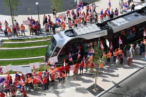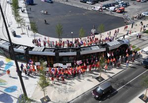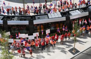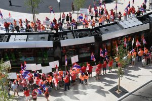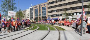 Drei neue Haltestellen der Tram wurden am Freitag eingeweiht und während Fanfarenklänge die offiziellen Gäste begrüßten, spielt oben am Glacis eine andere Musik. Mit einem Pfeifkonzert wurden die beiden Trams von zahlreichen Gewerkschaftern begrüßt, die sich wohlverstanden über das neue Transportmittel freuen, nicht jedoch über die Arbeitsbedingungen der dort Beschäftigten, zumal die Betreibergesellschaft zu zwei Dritteln dem Staat und zu einem Drittel der Gemeinde Luxemburg gehört und damit einen öffentlichen Charakter hat.
