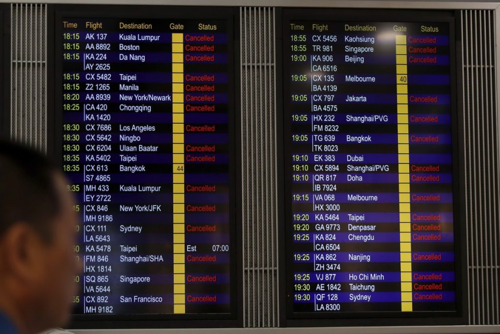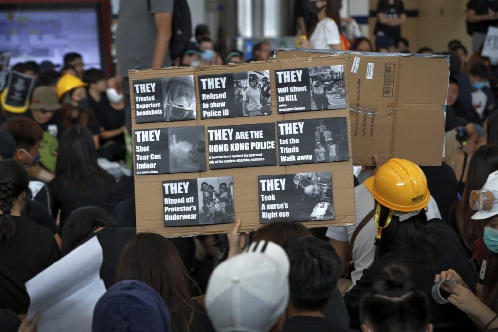 Schwarz gekleidete Aktivisten skandierten im Flughafen Parolen. Die Polizei solle einer Demonstrantin, die am Wochenende durch ein Gummigeschoss schwer im Gesicht verletzt worden war, ihr Auge „zurückgeben“. Viele der Demonstranten trugen aus Protest Augenbinden mit roter Farbe. Auch zeigten sie Bilder von Polizisten, die mit Schlagstöcken und Tränengas gegen die Demonstranten vorgegangen waren. Viele der Regierungsgegner verließen am frühen Abend den Flughafen. Einige Hundert blieben aber zunächst im Gebäude, wie die Hongkonger Zeitung „South China Morning Post“ berichtete.