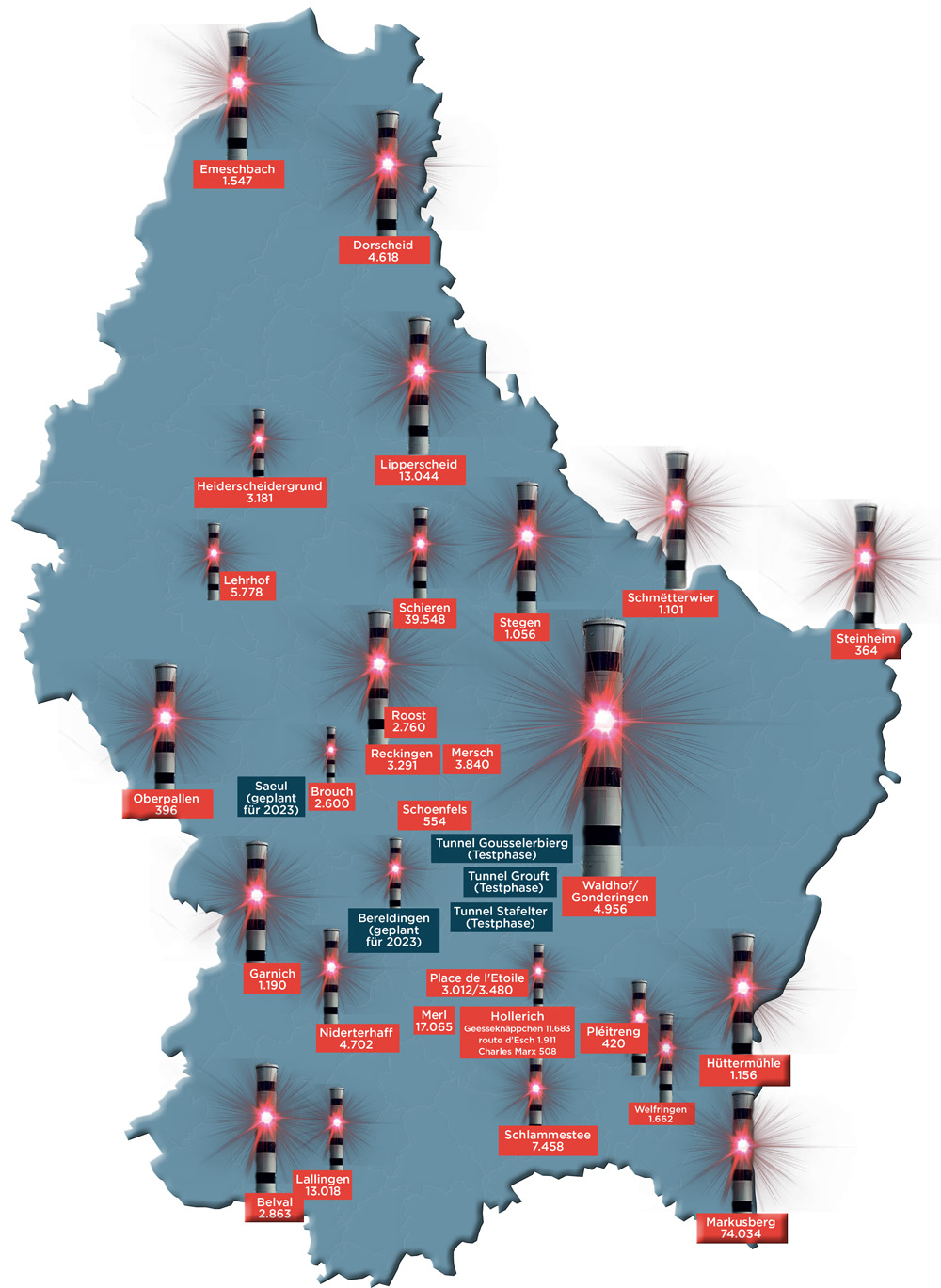 Die Betriebskosten für die 24 festen Blitzer, einen Rotlichtradar, fünf mobile Radare, zwei Baustellen- und zwei Streckenabschnitts-Radare beliefen sich im Jahr 2022 auf insgesamt 1.402.500 Euro. Dabei seien keine Personalkosten, aber dafür beispielsweise präventive Wartungsarbeiten mit inbegriffen. In Lipperscheid habe man ein Gerät wegen Vandalismus für 127.000 Euro ersetzen müssen. Das Verkehrsministerium erklärt zudem auf Tageblatt-Anfrage: „Dieses Jahr werden noch zwei weitere Blitzer installiert, einer in Bereldingen, der andere in Saeul.“