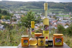 Nähe zur Natur und Liebe zu dem, was er tut, das strahlt sein Stand aus. Die Etiketten auf Honig, Propolistropfen und Honigschnaps wirken handgemacht. Da steht jemand mit seiner ganzen Person dahinter und nicht in erster Linie professionelle, wirtschaftliche Interessen. Ein großes Foto von René Toussaint (68) bei seinen Bienenvölkern begrenzt den Stand nach hinten. Es stammt aus der Nähe von Dippach.