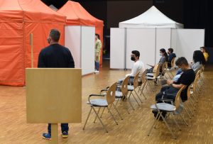 Mitten in der Turnhalle des „Atert-Lycée“ in Redingen stehen vier Zelte, zwei orangefarbene und zwei weiße. Hier hat sich das mobile Impfteam eingerichtet: eine Ärztin, drei Krankenpfleger und ein Notfallsanitäter. Letzterer muss eingreifen, falls ein Schüler nicht gut auf die Impfung reagieren sollte. Links und rechts der Zelte sind ein paar Dutzend Stühle in mehreren Reihen aufgestellt. Links sitzen die Schüler und warten, bis sie an der Reihe sind. Rechts ist die „Salle de repos“, wo die frisch Geimpften 15 Minuten Platz nehmen sollen, um sich auszuruhen. Jeder Schüler muss vor der Spritze eine unterschriebene Einwilligungsbescheinigung und seinen Ausweis vorzeigen. Die ganzen Regelungen wurden von der „Santé“ vorgegeben. Als Impfstoff kommt das mRNA-Vakzin von Biontech/Pfizer zum Einsatz.