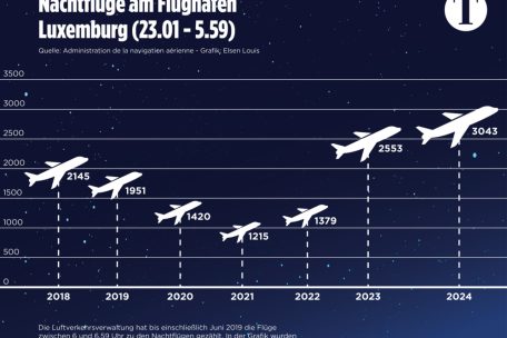 Mehr als 3.000 Flugzeuge sind 2024 während der nächtlichen Sperre in Luxemburg gelandet oder abgehoben – obwohl der Airport zwischen 23.01 und 5.59 Uhr geschlossen ist. Die meisten dieser Spätflüge starteten oder landeten zwischen 23.01 und 23.59 Uhr: 1.950 Flugzeuge. Das geht aus Daten der „Administration de la navigation aérienne“ (ANA) hervor. Und der nächtliche Lärm kommt immer öfter: 1.420 Nachtflüge wurden im Jahr 2020 verzeichnet. 2.553 im Jahr 2023 – und dann 3.043 im Jahr 2024.