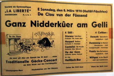 Im „De’ferdanger Annonceblad“ erschien 1961 eine ganzseitige Anzeige, in der neben dem offiziellen Namen „Dernier rendez-vous des masques“ erstmals auch der Schriftzug „Ganz Nidderkuer am Gelli“ bzw. „Niedercorn en délires“ zu lesen war. Wer die Idee hatte, den Ball in „Gelli“ umzubenennen, ist nicht gewusst. Jedenfalls ließ der Erfolg mit neuem Namen nicht lange auf sich warten. „In sechs Sälen fand eine Woche später unser Maskenball statt“, vermerkte der damalige Schriftführer und stellte fest, dass dem Verein auf Anhieb der nahtlose Übergang vom Hausball zum großen Maskenball gelungen war. So wurde der „Fuesbal“ schließlich zu einem festen Bestandteil des gesellschaftlichen Kalenders der Gemeinde Differdingen. Niederkorn hatte sich mit Veranstaltungen wie „Alles am Abseits“ (Progrès) und „Ganz Nidderkuer am Gelli“ (La Liberté) endgültig als eine der Karnevalshochburgen des Landes etabliert.