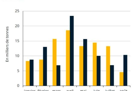 Ein Blick auf den Wert der Warenexporte in die USA zeigt einen Anstieg von 15 Prozent gegenüber den ersten acht Monaten des Vorjahres – ein positives Ergebnis im Vergleich zum europäischen Trend (etwa +10 Prozent im gleichen Zeitraum). Dieser Wertzuwachs trotz rückläufiger Mengen deutet Statec zufolge auf einen höheren Anteil teurerer Exportprodukte im Vergleich zum Vorjahr hin und betrifft die Mehrheit der EU-Länder. Der Wertanteil der USA an Luxemburgs Gesamtexporten liegt damit in den ersten acht Monaten 2025 – ähnlich wie in den Vorjahren – bei etwas mehr als 3 Prozent.