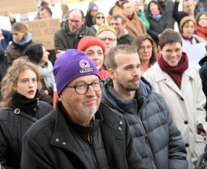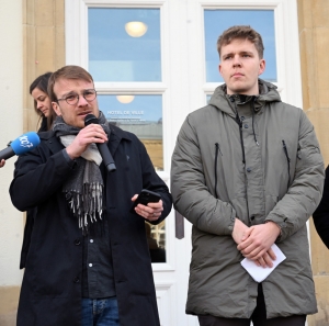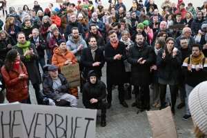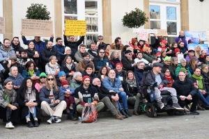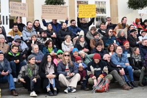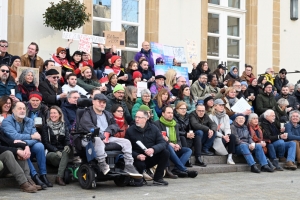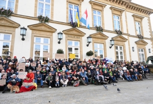 Nach den Ansprachen forderten die Organisatoren die Teilnehmer dazu auf, sich auf der Treppe vor dem Rathaus niederzulassen, jeder mit einem Becher in der Hand. Diese symbolische Geste sollte die Einheit und Entschlossenheit der Demonstranten unterstreichen.