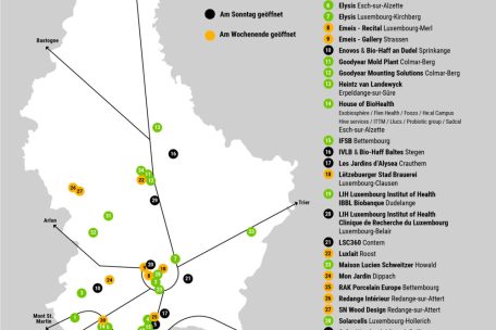Mit dabei sind dieses Jahr auch wieder eine Reihe Gesellschaften aus der Energiewirtschaft. So etwa die neue „agri-PV“-Anlage in Sprinkingen, wo Enovos Land nutzt, um Strom für 920 Haushalte zu produzieren, während gleichzeitig freilaufende Hühner Bio-Eier legen. Wer sich hingegen für Wind interessiert, der kann den „Wandpark Miersch“ von Soler in Rollingen besichtigen. Das Unternehmen hat landesweit 14 Windparks entwickelt. Auch SolarCells aus Hollerich, das neue Luxemburger Werk zur Herstellung von Fotovoltaikmodulen, wird seine Türen öffnen.