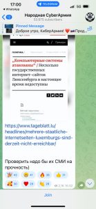 Dass das Tageblatt ebenfalls ins Fadenkreuz geriet, lag offenbar an der Berichterstattung der Redaktion. Screenshots der Tageblatt-Meldung über den Cyberangriff kursierten bereits kurz nach Veröffentlichung auf Telegram. „Wir sollten die Haltbarkeit ihrer Medienkanäle testen“ war – kurz bevor die Tageblatt-Seite lahmgelegt wurde – in den Hackerkanälen auf Russisch zu lesen. Kurz darauf wurde ein Screenshot gepostet mit dem Kommentar: „Konnte der Versuchung nicht widerstehen“ (mit Übersetzungssoftware übersetzt).