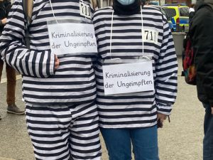 Er ist genesen, aber ungeimpft, fühlt sich auf der Arbeit ausgegrenzt. „Meine Kollegen reden zwar mit mir, aber ich merke ihre Zurückhaltung, weil ich nicht geimpft bin“, sagt er. Er passt nicht ins Bild, so wie viele der Demonstranten, deren plakative Botschaften eindeutig sind. „Kriminalisierung der Ungeimpften“ tragen zwei Teilnehmer auf Pappschildern über der Sträflingskleidung, die sie sich für den „Spaziergang“ angezogen haben.