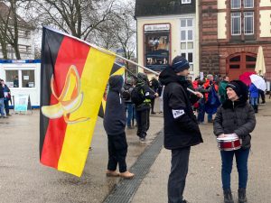 Für die meisten hier Anwesenden ist Deutschland längst eine Bananenrepublik und die Zahlen in ihren Augen nicht verlässlich. Das wird offen zur Schau getragen. Die Banane findet sich denn auch auf Deutschlandfahnen inmitten der Menschenmenge, nachdem ein Urteil deren Verwendung als „nicht strafbare Handlung“ eingestuft hat. Das berichtet die Saarbrücker Zeitung am 14. Januar 2022.