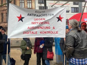 Es ist eine breite Mischung von „echten Antifaschisten“ bis bürgerliche Mitte, die es seit Dezember 2021 jeden Sonntag in Saarbrücken auf die Straße treibt. Heute sind nur 2.200 gekommen, eine Woche zuvor berichtete der SR von 5.800 Teilnehmer. „Das ist das Wetter“, sagt ein Teilnehmer. Gregor* geht regelmäßig mit – auch wenn es regnet. Das tut es an diesem Sonntag heftig und es windet.