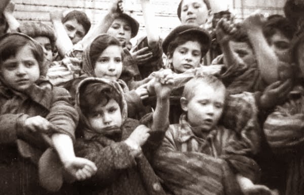 Foto: Kinder im gerade befreiten KZ Auschwitz zeigen dem Fotografen ihre eintätowierten Häftlingsnummern.