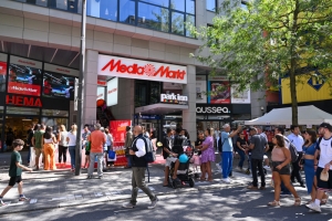 Doch nicht nur gab es wenig Interessenten bei den Regenschirmen, insgesamt scheinen weit weniger Menschen im Bahnhofsviertel unterwegs gewesen zu sein. An diesem „Fouerméindeg“ waren zwar weit mehr potenzielle Kunden in den Straßen des Bahnhofsviertels unterwegs als an einem normalen Wochentag, doch nichts im Vergleich zu früheren Zeiten, als man sich mühsam einen Weg durch die zahlreichen Kauflustigen bahnen musste. Vereinzelt sah man zwar Menschengruppen, so wie vor einem bekannten Elektrofachladen, der es mittels eines Gewinnspiels fertigbrachte, dass es stets eine Warteschlange vor dem Geschäft gab.
