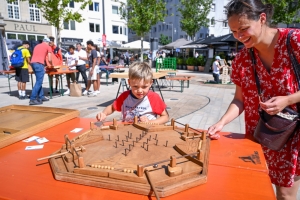 Die Braderie sollte familienfreundlicher werden, hatte es auf der gemeinsamen Pressekonferenz der Gemeinde und des „Stater Geschäftsverband“ geheißen. Zu diesem Zweck wurden an einigen Stellen Spiele organisiert, wie z. B. auf dem Knuedler. Allerdings ließen sich bei unserem zweimaligen Vorbeischauen sehr wenige Jugendliche zu Basketball oder Fahrradfahren hinreißen. Lediglich einige Skateboardfahrer nutzten die für sie aufgestellten Rampen, ansonsten hielt sich der Spaß in Grenzen. Vielleicht waren die Bücher, die „Ernster“ zum Kilopreis von fünf Euro auf dem Platz verscherbelte, eine zu große Konkurrenz.