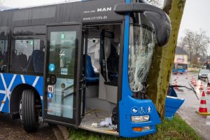 Der Bus der Linie 25 war im Berufsverkehr beim Rechtsabbiegen von der Kaiser-Wilhelm-Brücke auf das Martinsufer aus bislang unbekannten Gründen von der Fahrspur abgekommen und gegen einen Baum in der Straßenmitte gefahren, wie es von der Polizei hieß. Rund 120 Rettungskräfte waren laut Feuerwehr vor Ort. Das Martinsufer wurde gesperrt, es kam zu erheblichen Verkehrsbehinderungen. Um Eltern und Kinder vor Schaulustigen zu schützen, wurde nach Angaben der Feuerwehr auch die Toni-Chorus-Halle abgesperrt.