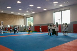 Der große Saal bietet optimale Bedingungen für Handball, Futsal oder Volleyball. Der Boden wurde so ausgelegt, dass sich die Sportler nicht unnötig schwer verletzen. Während Sportevents oder Trainings bietet die Halle mehr als 390 Sportlern Platz. Bei den Lampen handelt es sich um energiesparende LED-Lampen, die ein optimales Licht garantieren – vor allem, wenn Sportveranstaltungen live übertragen werden. Auch an die Zuschauer wurde gedacht – rund 300 Sitzplätze bietet die Tribüne, und im angrenzenden Ausschank können sich 150 Personen aufhalten. Auch die Anzeigetafeln sind sehr modern: Sie zeigen nicht nur die Ergebnisse, nein, es können auch kleine Clips abgespielt werden.