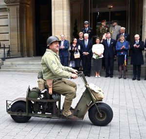 Die Feierlichkeiten in Gedenken an die Befreiung am Dienstag begannen mit einem Korso von 13 historischen amerikanischen Militärfahrzeugen. Um ins Stadtzentrum zu gelangen, nahmen sie die gleiche Route wie die Befreier vor 80 Jahren. Los ging es in der route de Longwy in Bartringen, über die avenue du X Septembre bis zur rue du Fossé, um dann auf die place d’Armes einzubiegen. Vier der Fahrzeuge – zwei Motorräder und zwei Autos – blieben unterdessen auf der place d’Armes. Großherzog Henri und seine Frau sowie zahlreiche politische Würdenträger begutachteten die Militärfahrzeuge und begrüßten die Nachkommen des Generals Erret, die extra für die Gedenkzeremonie aus den Vereinigten Staaten angereist waren. Vor allem die beiden Pkws haben eine ganz besondere Bedeutung in der Geschichte der Hauptstadt: Es handelt sich hier nämlich um einen Jeep der Marke Willys (Modell „Overland“) sowie einen Dodge Luxury. Beides identische Nachbauten der Fahrzeuge, mit denen Prinz Félix am 10. September 1944 in Luxemburg einfuhr bzw. Großherzogin Charlotte, die am 14. April 1945 aus ihrem Exil in Großbritannien ins Großherzogtum zurückkehrte.