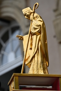 Sankt Willibrord wurde 658 in Northumbrien im Nordosten Englands geboren. Sein Vater gab ihn als Knaben in die Obhut eines Klosters. Von dort aus zog er im Alter von 20 Jahren nach Irland, wo er 688 zum Priester geweiht wurde. Zwei Jahre später setzte er als Missionar aufs europäische Festland über, wo er im Laufe der Jahre durch Schenkungen und einflussreiche Freunde Klöster und Kirchen bauen konnte. So auch 698 in Echternach, wo er sich gerne von seinen Missionsreisen erholte und wo er 739 im Alter von 81 Jahren gestorben ist. Seinem Wunsch entsprechend wurde er in seiner damals noch bescheidenen Kirche beigesetzt.
