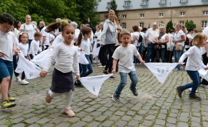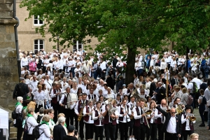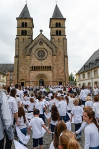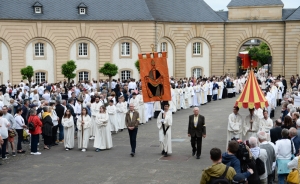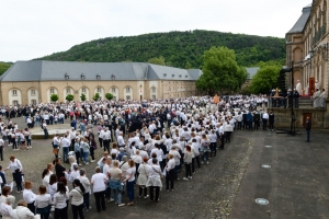 Die ersten Besucher werden bereits in aller Frühe in Echternach eingetroffen sein. Für die Messe um acht Uhr in der Basilika, einen Besuch im Abteimuseum mit dem Codex Aureus oder, sehr profan, um einen der raren Parkplätze im Zentrum zu ergattern. Später muss man per Busnavette in die Innenstadt. Jene, die an der Springprozession teilnehmen, zieht es ab halb neun in den Ehrenhof der Abtei. Dort werden die Gruppen eingeteilt und aufgestellt. Alles ist bestens organisiert. Es gibt sogar einen richtigen Aufstellungsplan mit Nummern.