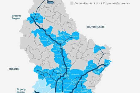 2021 wurden ins Luxemburger Gasnetz 53 GWh Biogas injiziert. Der Verbrauch des Landes lag aber insgesamt bei 8.708 GWh – also 164 Mal höher. Anders ausgedrückt: Luxemburg ist komplett vom Import abhängig, muss fast 100 Prozent des im Land verbrauchten Gases importieren. Das passiert über drei „Eingangspunkte“. An zwei Stellen – Petingen und Bras – überqueren Pipelines aus Belgien das Land; bei Remich eine Pipeline aus Deutschland, die an die mitteleuropäische Gasleitung „Megal“ angeschlossen ist.