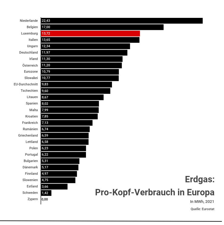 Eigentlich macht Erdgas nur 15 Prozent im Luxemburger Energiemix aus. Da scheinen andere Länder abhängiger von dem Brennstoff aus der Erde zu sein: Italiens Energiemix bestand 2019 zu 38,6 Prozent aus Gas, Deutschlands zu 24,4 Prozent. Allerdings hat Luxemburg – Tanktourismus sei Dank – generell einen äußerst großen Energiehunger. Deshalb sieht die Statistik ganz anders aus, wenn man den Gasverbrauch mit der Einwohnerzahl verrechnet – dann ist Luxemburg plötzlich mit einem Gasverbrauch von 13,7 Megawattstunden pro Kopf Europas drittgrößter Gasverbraucher.