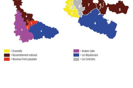 In Meurthe-et-Moselle konnten sich am Sonntag hingegen in drei von sechs Wahlkreisen linke Kandidaten durchsetzen. In den beiden „circonscriptions“ von Nancy siegte der Nouveau Front Populaire (NFP). Eine interessante Randnotiz: Die zweite „circonscription“ (Nancy-West) war der einzige Wahlbezirk in den beiden grenznahen Départements, in denen drei Kandidaten in die Stichwahl gingen. Emmanuel Lacresse, Kandidat von Ensemble und nach dem ersten Wahlgang Zweitplatzierter hinter Stéphane Hablot vom NFP, hatte seine Kandidatur für den zweiten Wahlgang nicht zurückgezogen. Auch ohne republikanische Front reichte es hier für einen Sieg des Linksbündnisses. Der NFP kommt damit auf zwei Sitze aus der Großregion. Im westlichsten Wahlbezirk von Meurthe-et-Moselle um Toul setzte sich außerdem mit Dominique Potier ein linker Kandidat und aktueller Abgeordneter durch, der jedoch nicht für den NFP angetreten war.