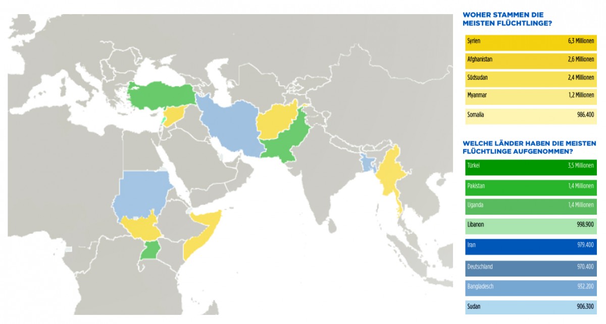 Blickt man auf die restlichen Staaten der „Top 10“, zeigt sich, dass Flüchtlinge selbst in benachbarte Krisenstaaten fliehen. Auf Platz zwei folgt hinter der Türkei Pakistan. Im Nachbarstaat Indiens waren 2017 rund 1,4 Millionen Flüchtlinge. Der Iran wird meist thematisiert, wenn Donald Trump mal wieder richtig schön in die Twitter-Tasten haut. Was der große Geopolitiker dabei stets ausklammert: der Iran hat rund eine Million Flüchtlinge aufgenommen. Alleine 951.100 stammen aus Afghanistan. Die US-Invasion und der Taliban-Terror haben diese Fluchtbewegung gefestigt.
