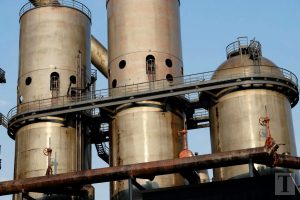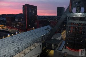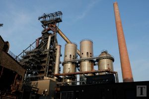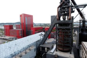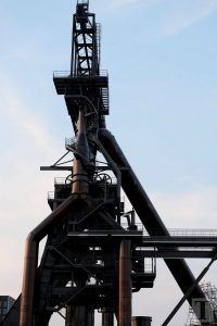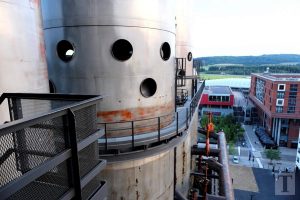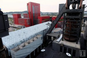 In unmittelbarer Nähe zum erklommenen Hochofen – und bei einem angenehmen kühlen Lüftchen, das einem dort oben liebevoll über die Haut strich – sah man hinunter auf die aktuellen Anlagen von ArcelorMittal, die bei weitem nicht so klinisch sauber erschienen wie der zur Besichtigung herausgeputzte Hochofen. Links daneben befindet sich der gewaltige Turm der Uni Luxemburg, etwas weiter jener des Hauptgebäudes der BIL.