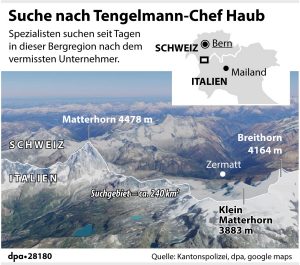 Am frühen Morgen noch Schneeflocken, dann bestes Wetter mit strahlendem Himmel und Matterhorn-Sicht in Zermatt: Man meint, die Suche nach dem vermissten Tengelmann-Chef Karl-Erivan Haub könnte weitergehen, aber der Schein trügt. 2.000 Meter höher stürmt es am Donnerstag im Gletschergebiet, wo sich die Spur des Unternehmers am vergangenen Samstag verlor. Die Retter können vorerst nichts tun.