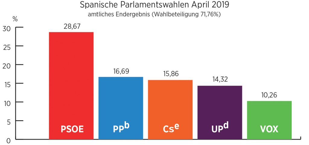Die Partei Vox steht rechts von Ciudadanos und PP. Bei der Andalusien-Wahl im Jahr 2018 machte sie zum ersten Mal europaweit von sich reden. Spanien, das bislang von rechtspopulistischen Auswüchsen verschont geblieben war, hatte plötzlich seine Rechtsaußen-Partei.