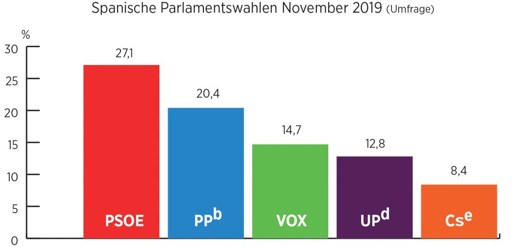 Die Spanier wählen am Sonntag zum vierten Mal in vier Jahren ein neues Parlament – und bereits zum zweiten Mal in diesem Jahr. Dabei sah es nach den vorgezogenen Neuwahlen vom vergangenen April erst so aus, als könne die Koalition, bestehend aus der sozialistischen PSOE, der linken Podemos sowie jeweils zwei kleineren katalanischen und baskischen Regionalparteien, weitermachen. Doch es sollte nicht dazu kommen.
